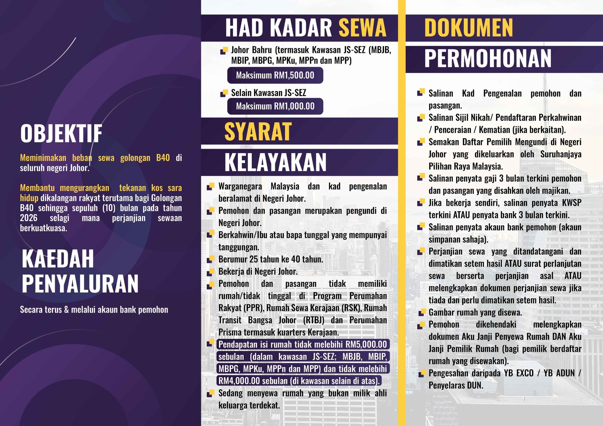 (新山26日讯)柔佛政府推出租屋援助(Bantuan Sewa Rumah)计划,家庭每月收入未及4000令吉或5000令吉,且租金在1000令吉或1500令吉以下,附合条件的人民可申请每月200令吉的租屋补贴。