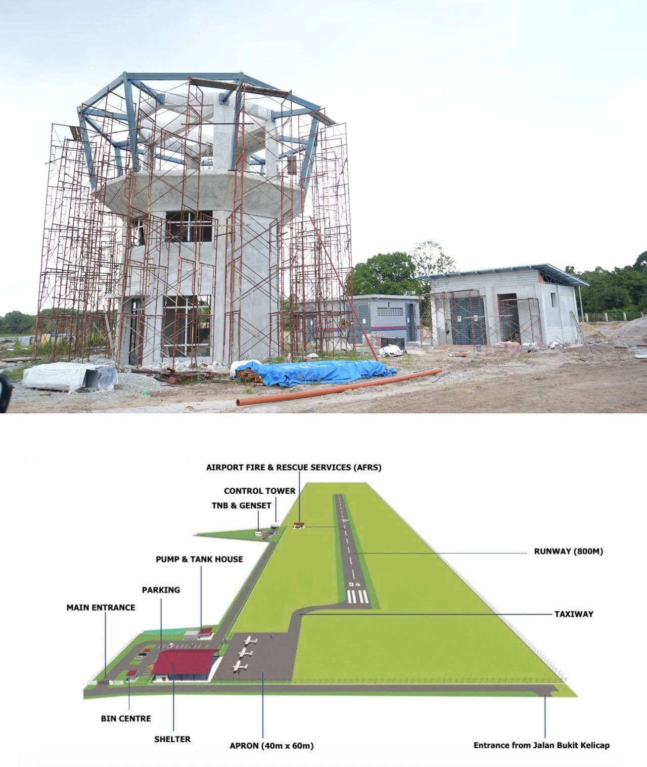 他说,该机场占地56英亩,配备有一条 800公尺长的跑道,以及一座12公尺高的交通管制塔。
