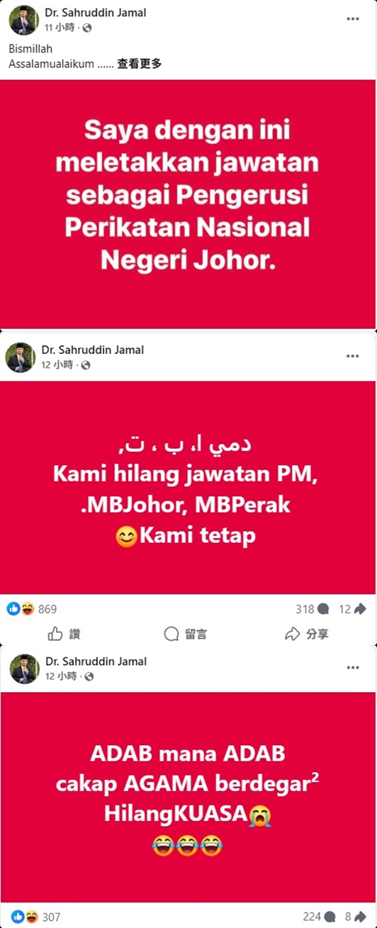 与慕尤丁是师徒关系的沙鲁丁嘉马,随后也在社交媒体发文,辞去国盟柔佛主席职位。