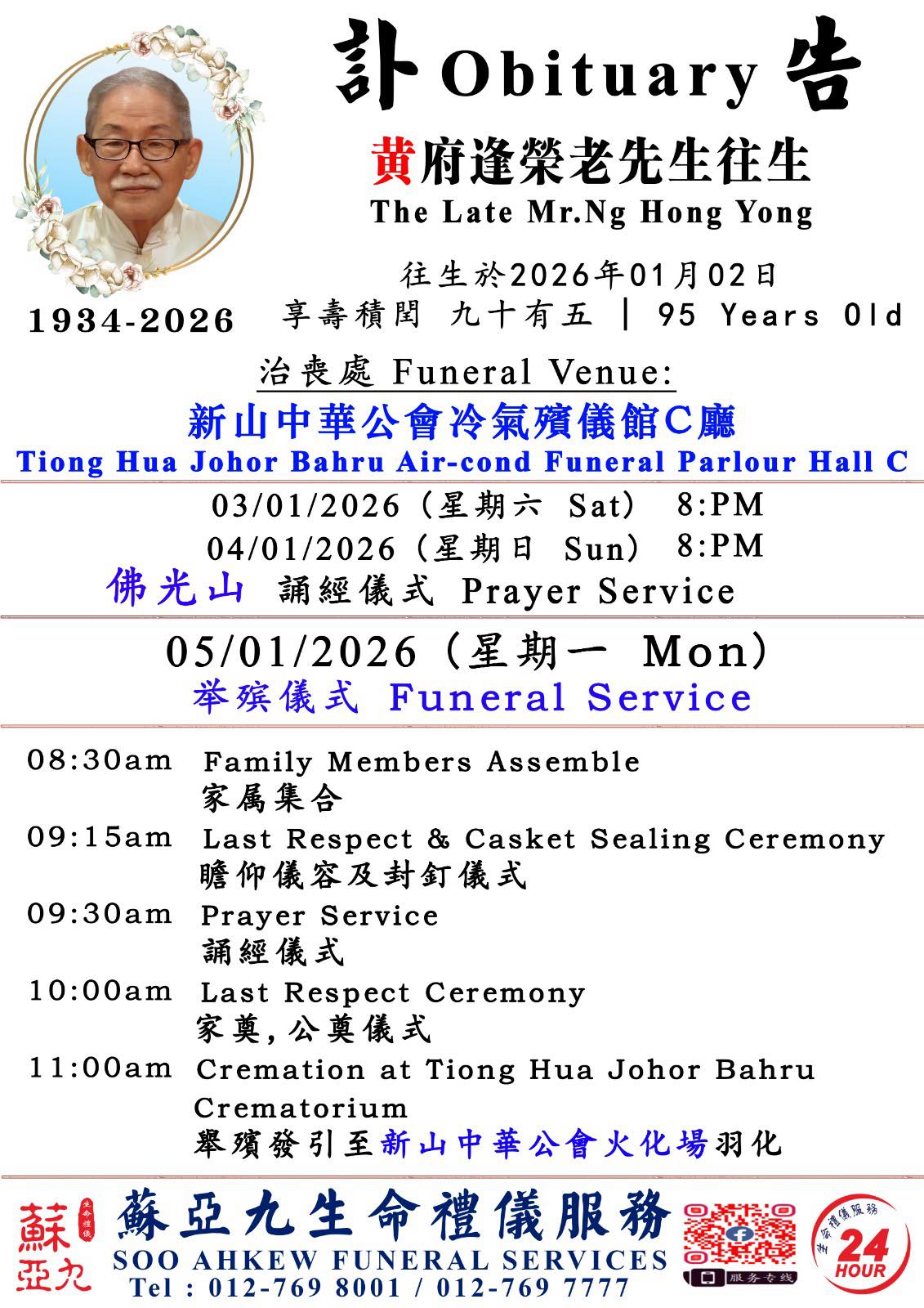 黄逢荣治丧处设于新山中华公会冷气殡仪馆C厅,择定1月5日(周一)上午11时举殡。