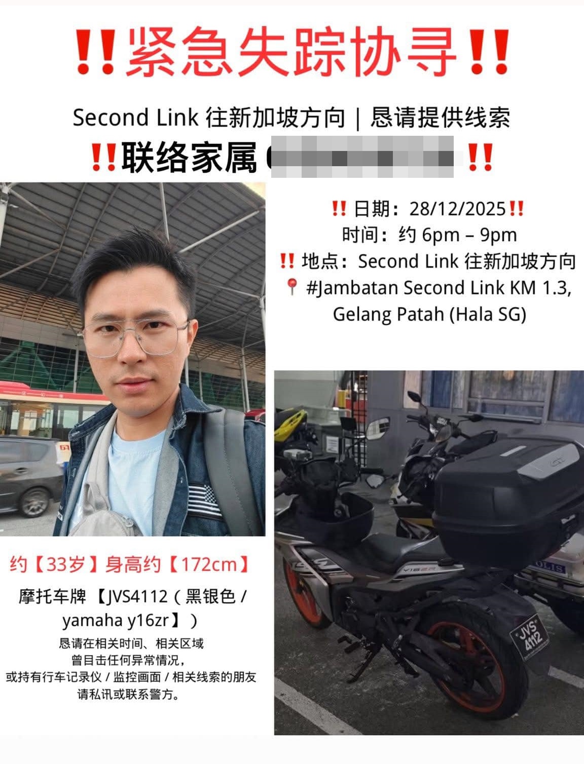 华裔男子郑国强(33岁)是于去年12月28日晚上,在马新第二通道往新加坡方向1.3公里处坠下桥失踪。