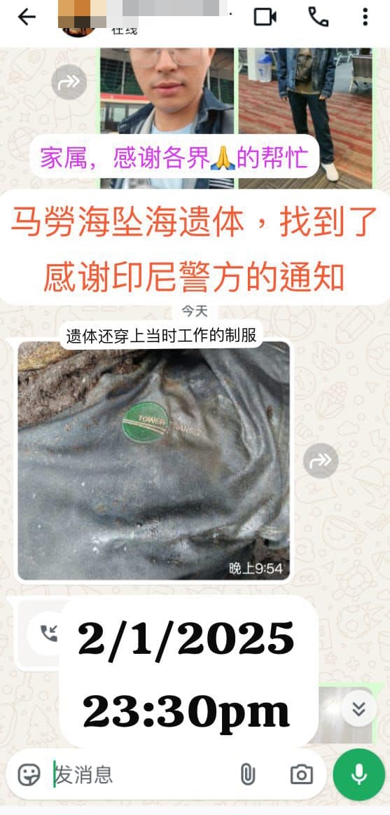 唯昨晚(1月2日)晚上11时30分,印尼警方通知,在该国海域寻获郑国强遗体,遗体身上还穿着工作制服,妻子将前往印尼办理认尸和领事手续。