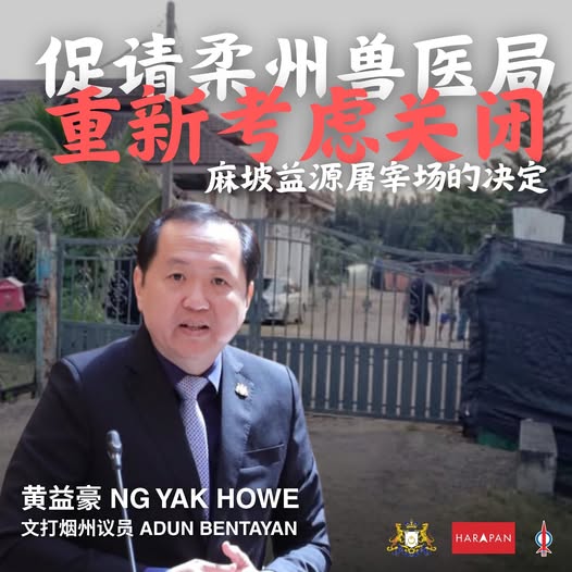 黄益豪针对近日麻坡益源屠宰场被勒令停止运营一事,郑重促请柔佛兽医局从整体公共利益出发,重新审视并考虑有关决定。