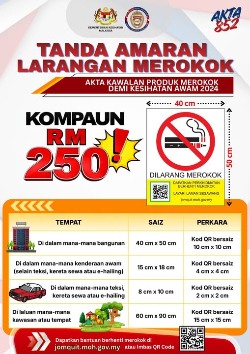 柔佛卫生局发出通告,所有场所、禁烟区和公共交通工具,都必依据2024年公共卫生烟草及吸烟产品管制法令(第852号法令)的规定张贴“禁止吸烟”告示。