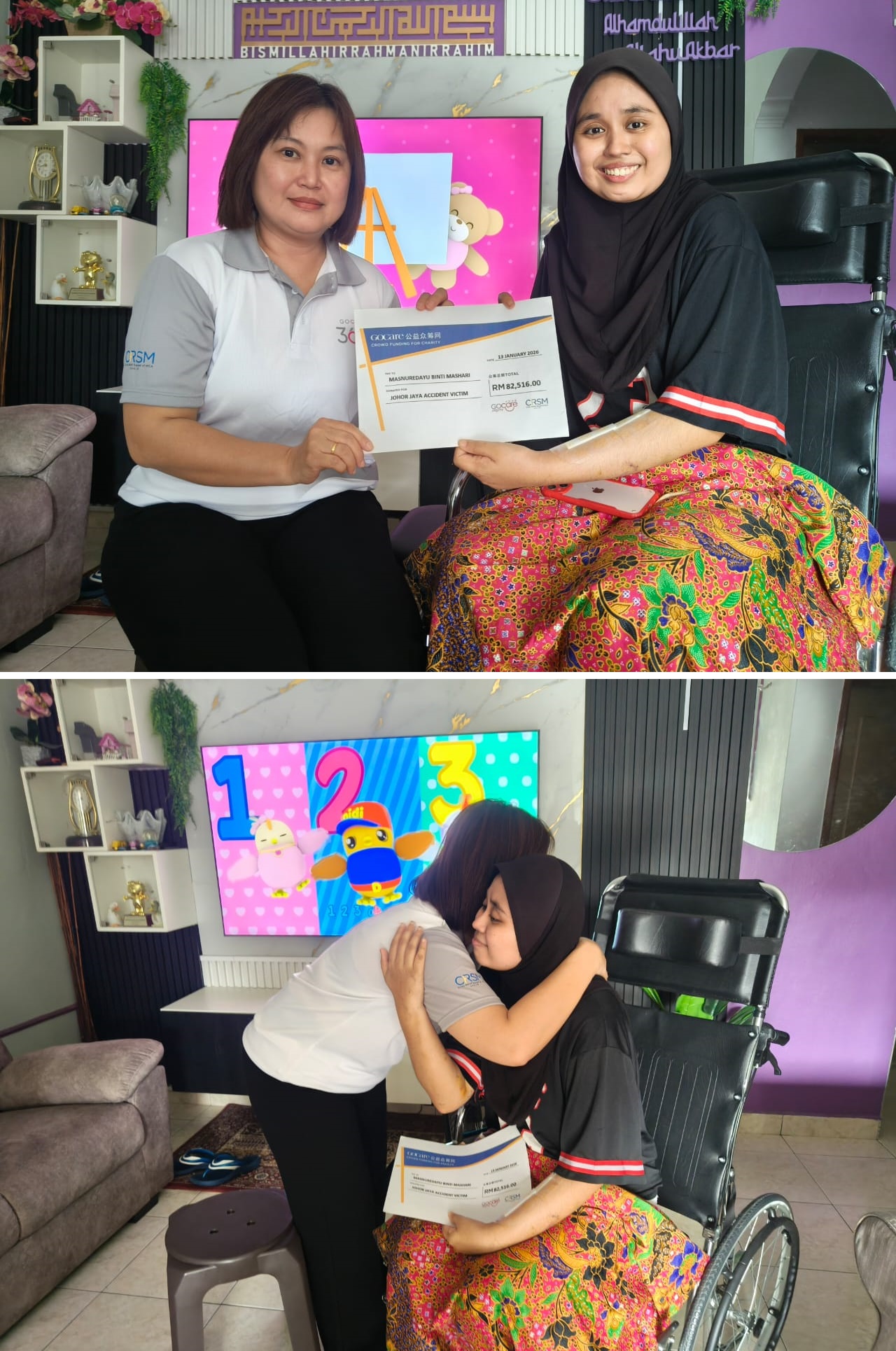 (新山22日讯)柔佛再也车祸毁天伦,失去丈夫的伤者Ayu接受手术后,目前回娘家休养,马华志工团将筹集的8万2516令吉移交给对方,协助她渡过艰难时期。