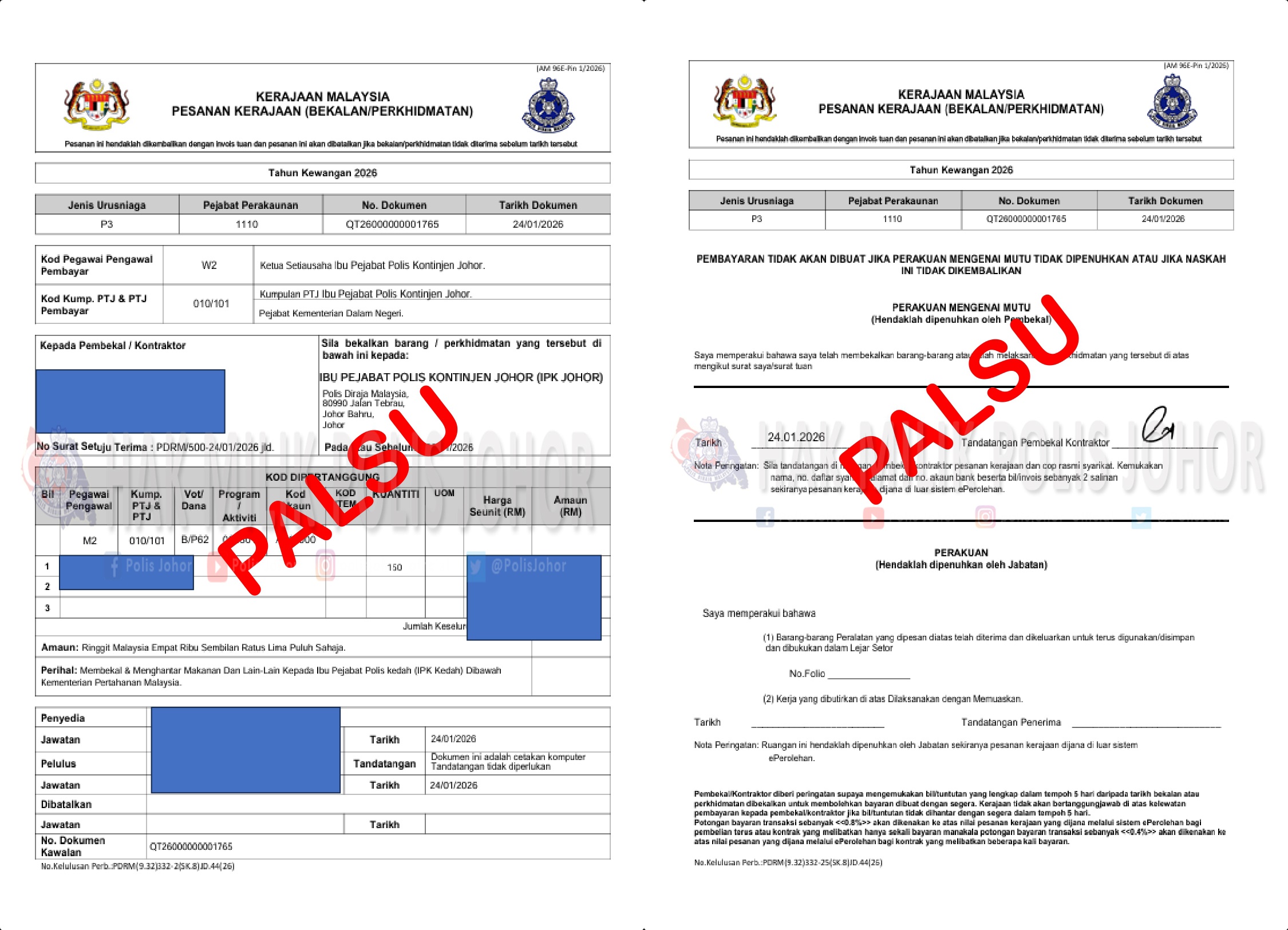 柔佛总警长拿督拉哈曼今日发文告指出,由于嫌犯(老千)提供了伪造的政府官方订单文件副本,2名业者不疑有诈,坠入圈套。