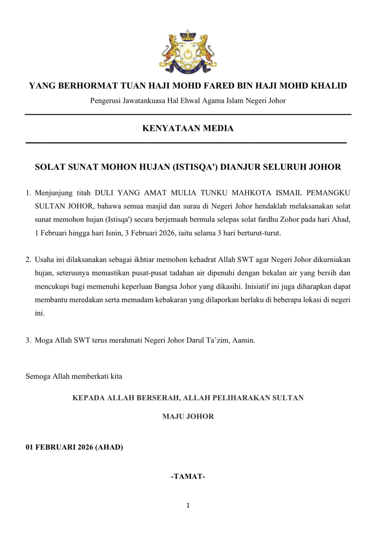 掌管柔佛宗教事务的行政议员莫哈末法烈发通告指出,奉摄政王之命,柔佛所有清真寺和祈祷室必须于2月1日至2月3日,连续3天,在晌礼(Zohor)后,进行集体祈雨(Istisqa’)仪式。