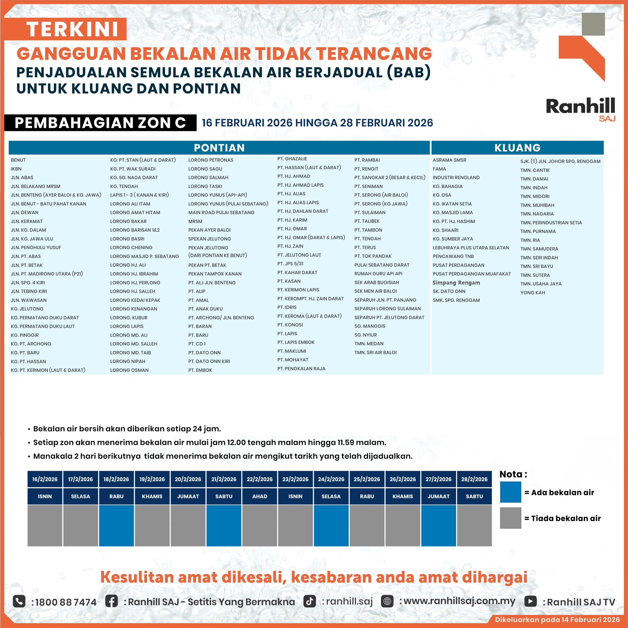柔佛水务联熹有限公司(SAJ Ranhill)发出通告,调整2月份的定时供水 (SWS)时间表。调整原因是吗什水坝水位持续下降,当局正密切监测供水情况。