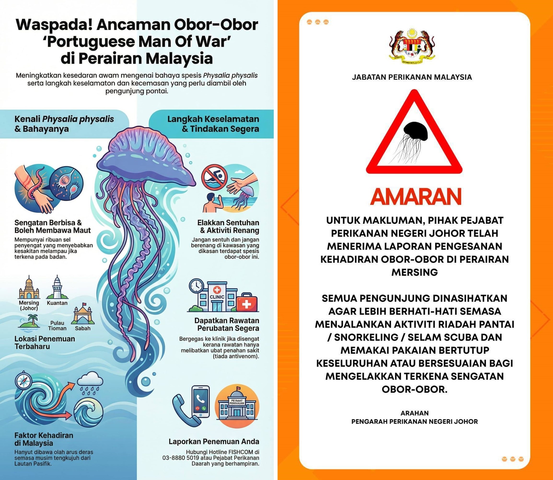 如果公众和游客,在其他地区发现这些水母,请通过最近的县渔业局办公室室,通知大马渔业局,以便立即发布公告和禁令。