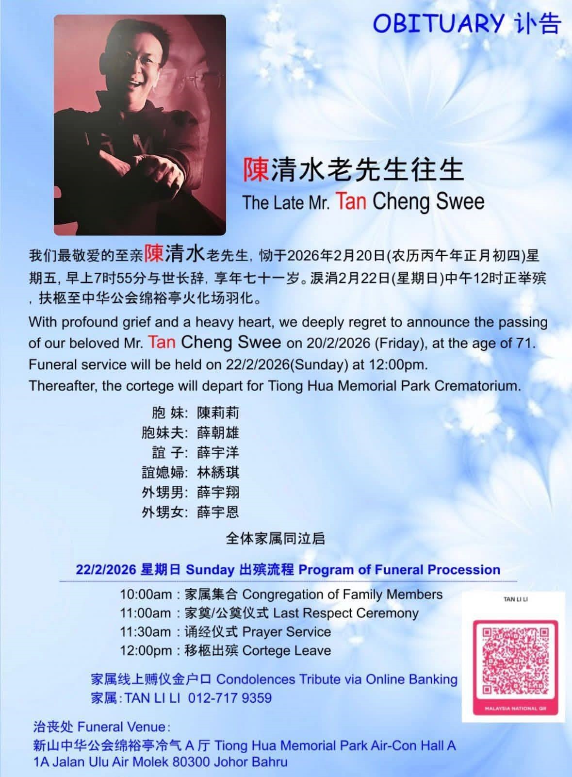 陈清水的灵堂设于新山中华公会绵裕亭冷气A厅,将于2月22日中午12时举殡,扶柩至绵裕亭火化。