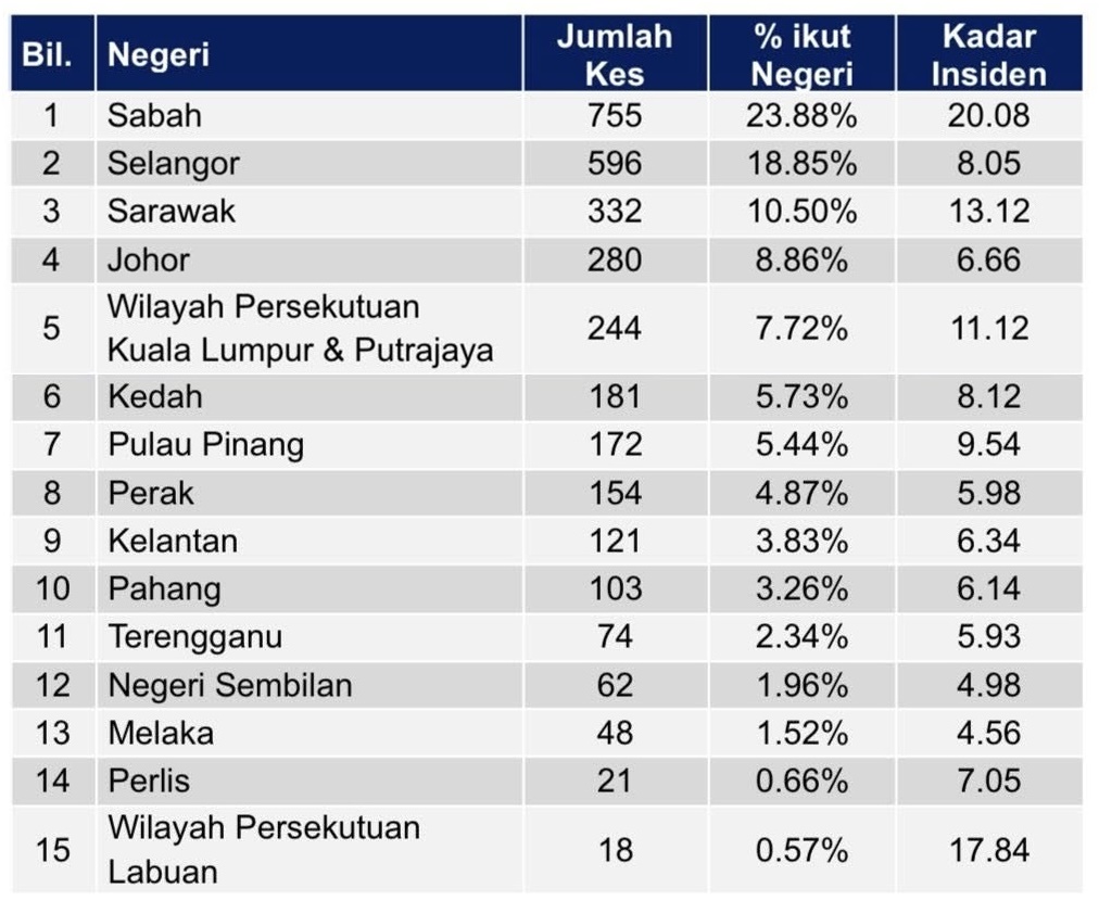 (布城21日讯)我国再新增596宗肺结核病例,累计病例达3161宗。其中,柔佛以280宗居全国第四。