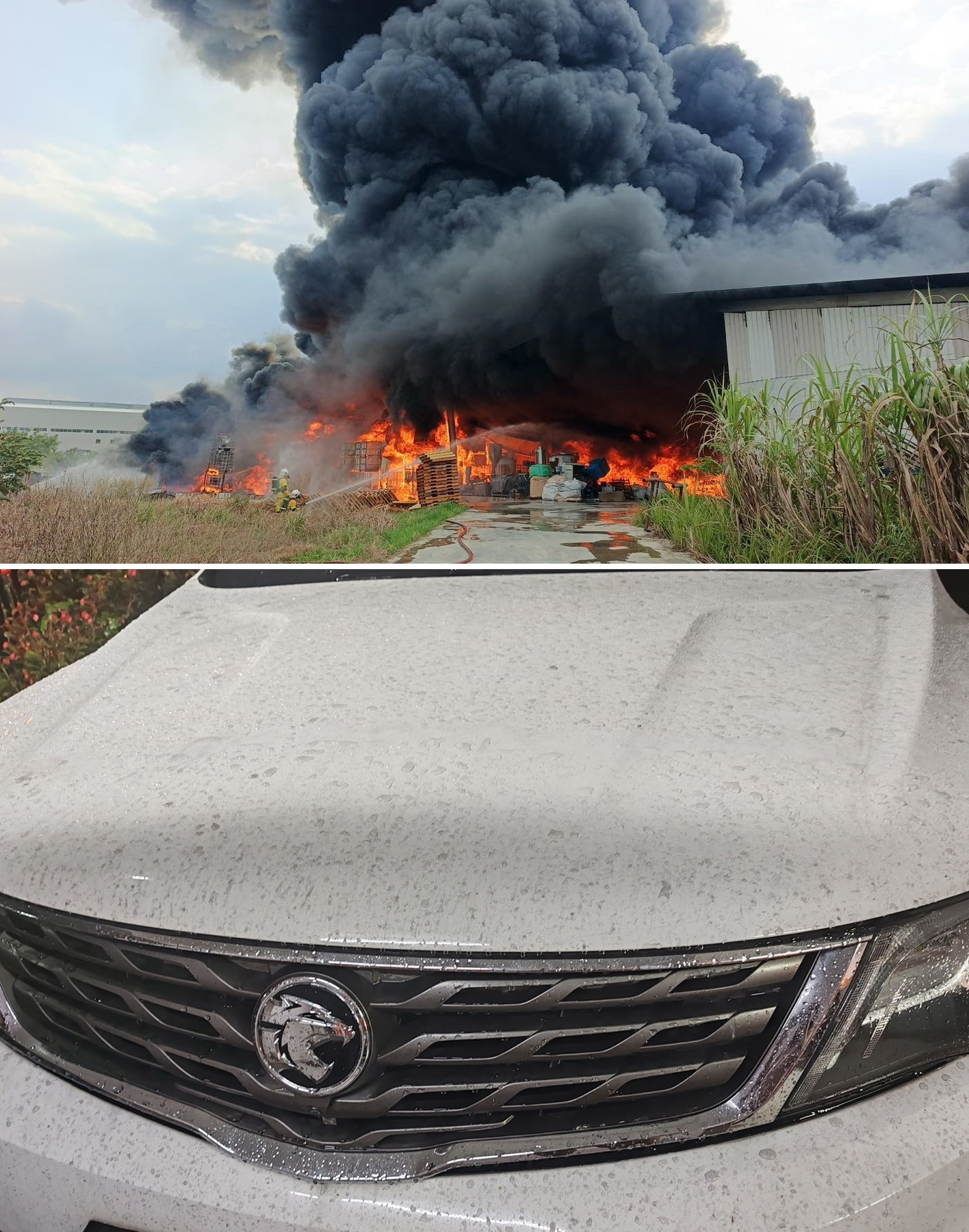 昨日下午4时许,因为新港一间塑料厂发生火灾,产生大量的浓烟,刚好又遇上大雨。结果,降起罕见的“黑雨”。