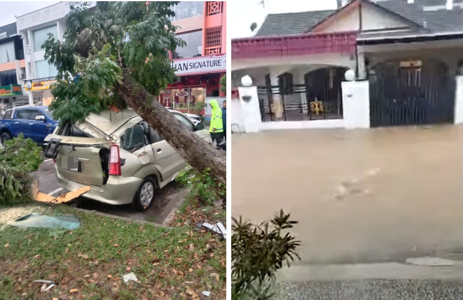 (新山25日讯)下午一场大雨,大树连根倒下压中轿车“翘起来”,同时住宅区更是“开门见河”。