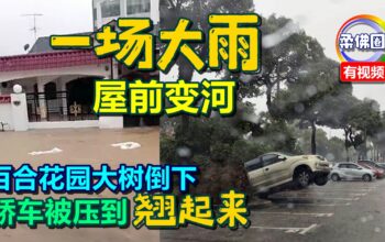 今日下午4时许,新山降起大雨,茂奥斯丁、百合花园、百万镇、长春山庄、美家乐至马西一带,都传出水患,多条大路出现积水,也发生树倒事件。
