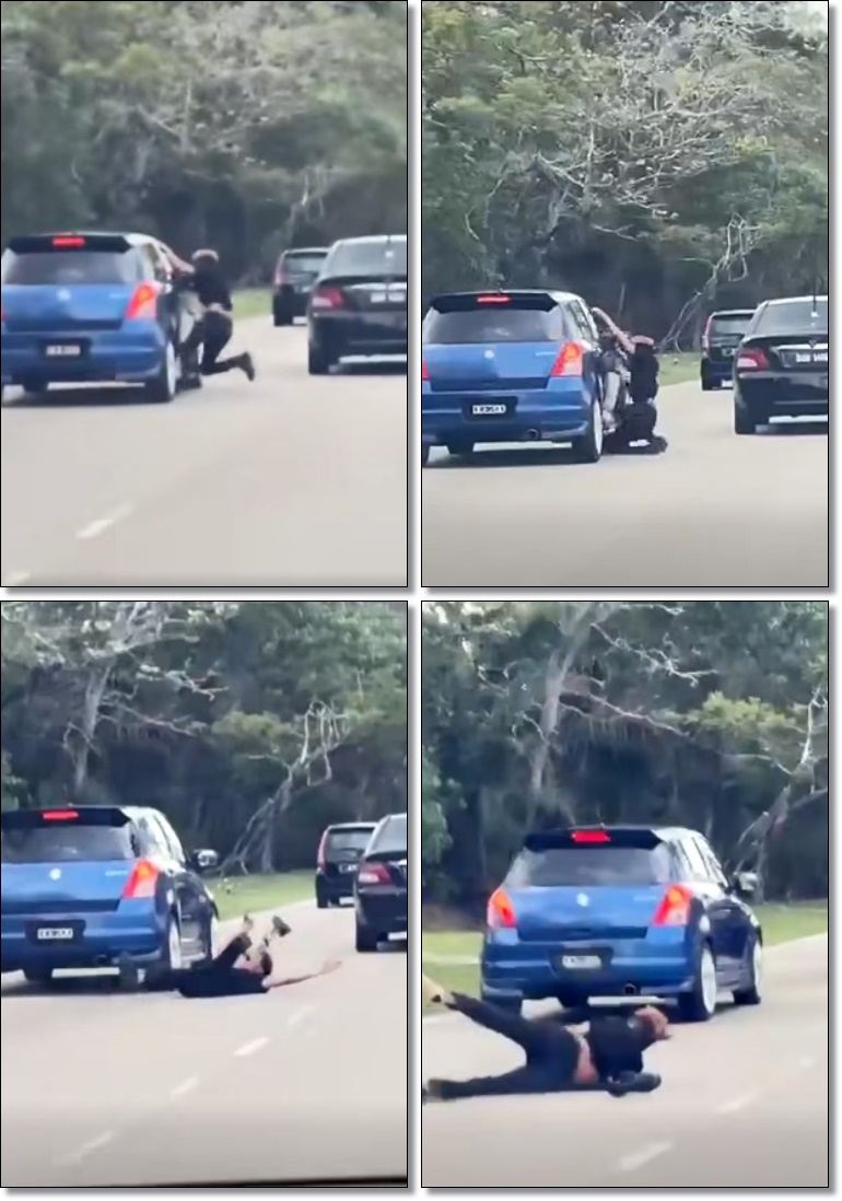 事件于昨日下午3时50分,在至达城(Seri Alam)。有关视频网上流传,一名男子“挂”在蓝色轿车右侧,接着跌落在路上,鞋子也甩飞出去。