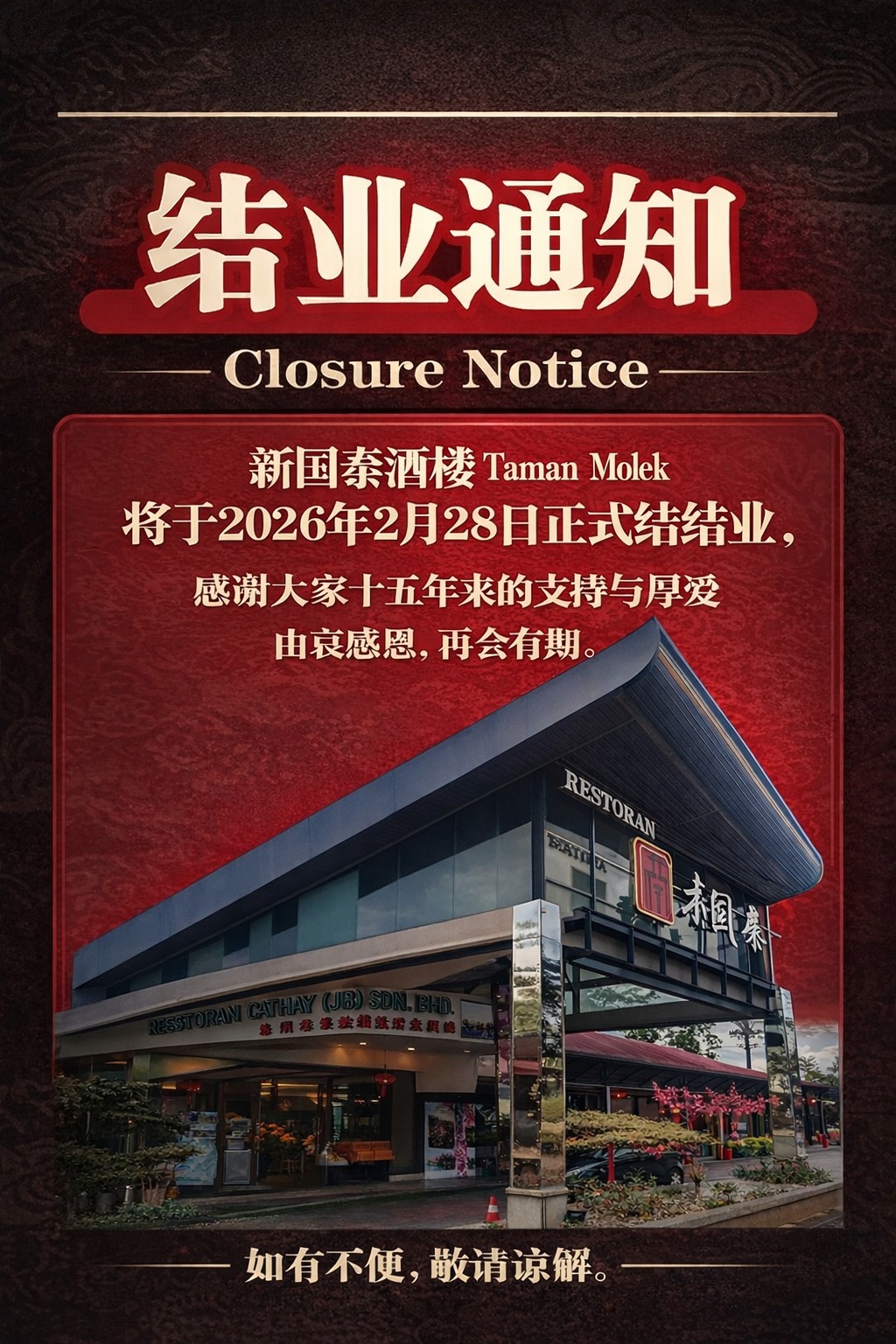 (新山1日讯)百合花园新国泰酒楼,过去15年见证宴席上美好时刻,昨日(2月28日)熄灯!