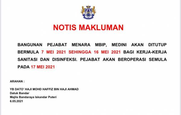 同时,依斯干达公主城市长拿督莫哈末哈菲兹昨日(6日)也发出通告,位于美迪尼的市政局的办事处大厦,将于今日(5月7日)起至5月16日关闭,以便进行彻底消毒工作。该大厦将于5月17日才恢复运作。