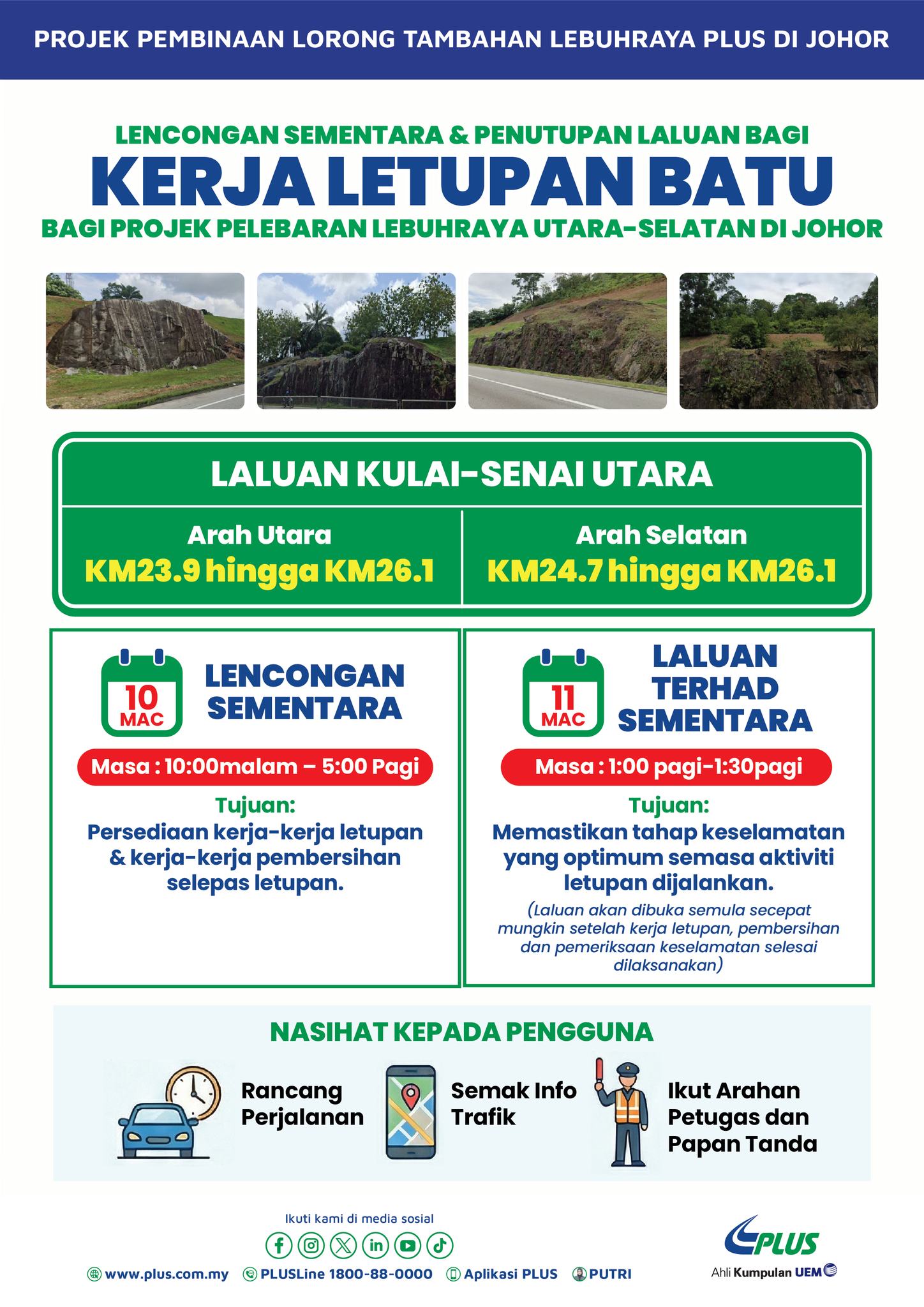 同时,3月11日凌晨约1时,古来交界处至士乃北路段会关闭数分钟,为确保炸石作业安全,禁止所有车辆通行。