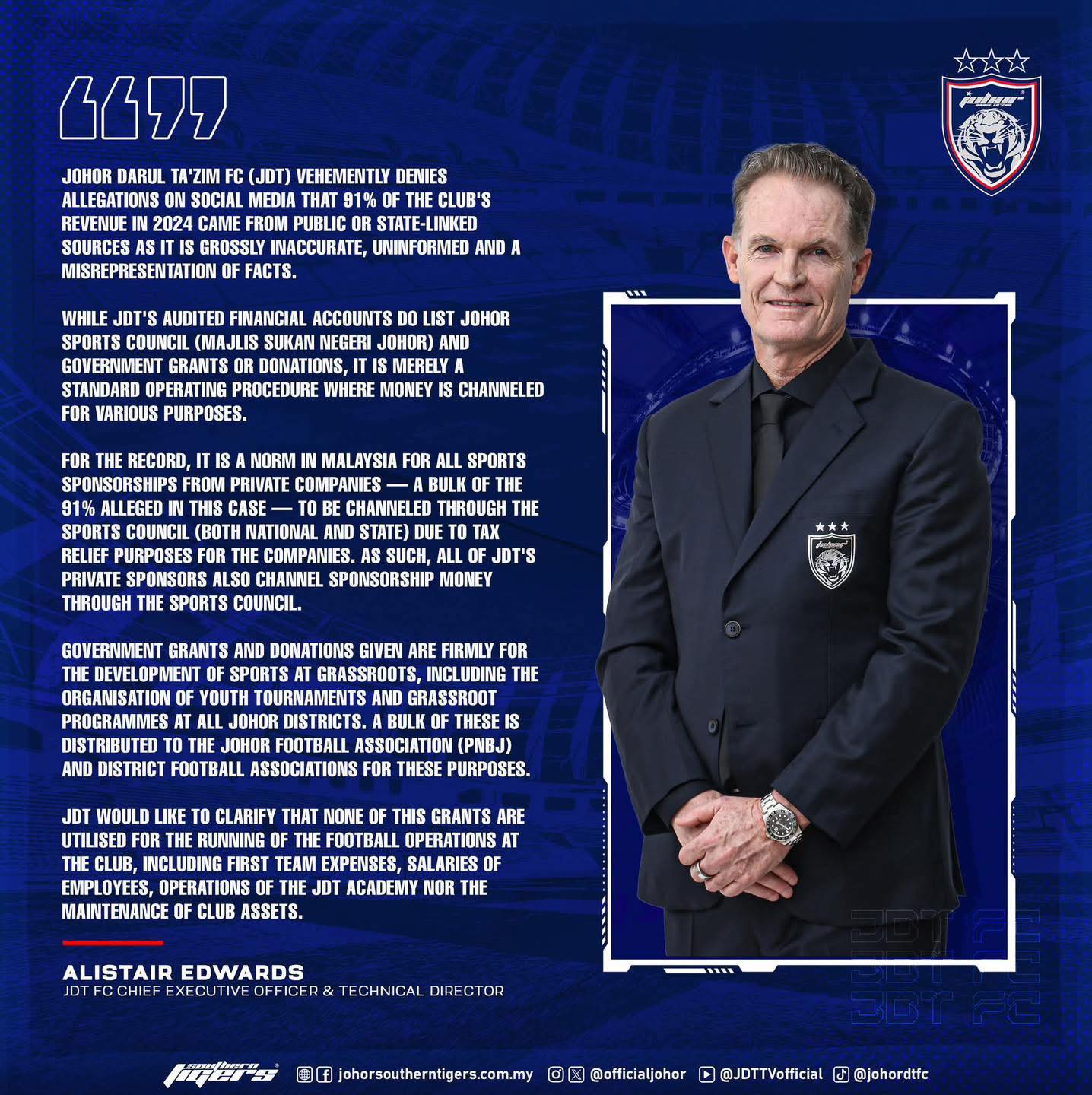 他说,正如JDT所解释的,财务报表中提及柔佛体育理事会及相关政府渠道,是国家体育赞助体系中的正常行政程序。