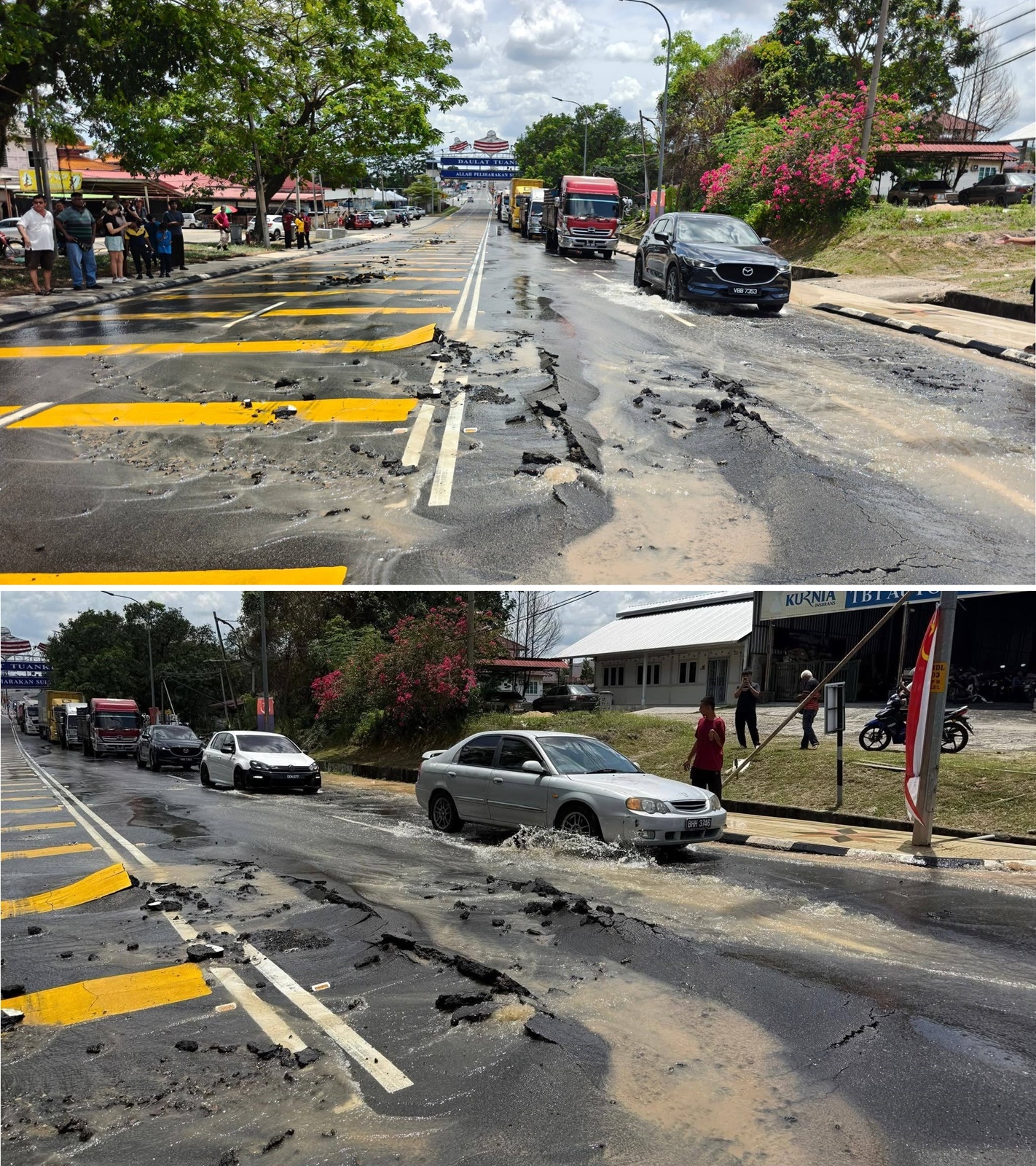 (昔加末11日讯)地下水管破裂,造成路面也凸起崩裂,交通严重受影响,更造成周边地区水供受影响。