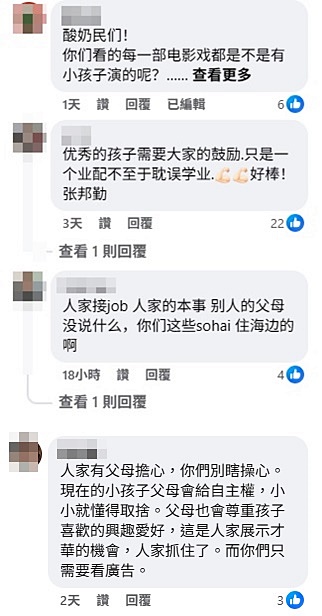 甚至有人反讽批评者:“如果是你的孩子接业配,你可能就不同说法了。”