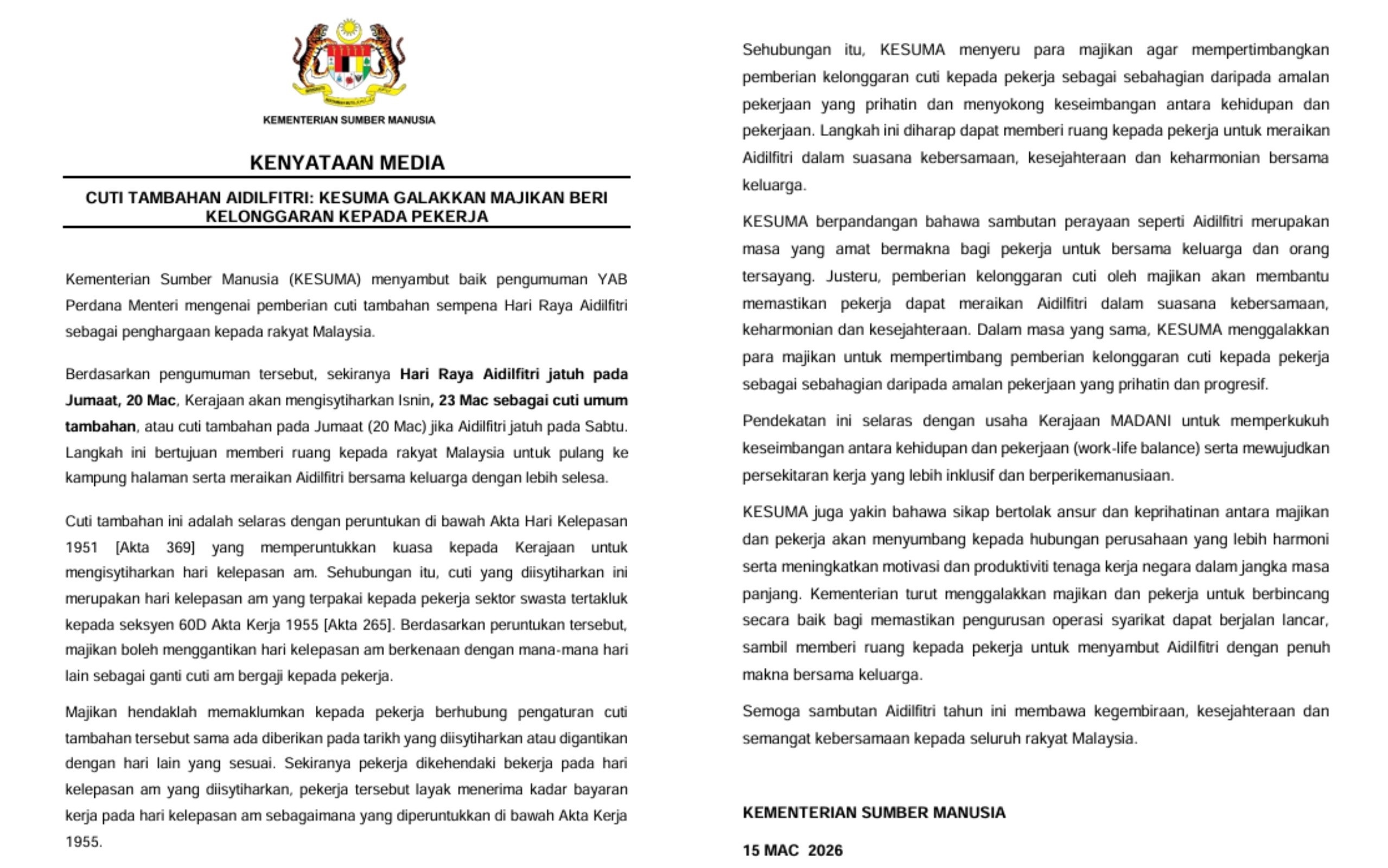 为此,人力资源部呼吁雇主给予员工强性休假,支持员工的工作与生活平衡,让员工在温馨、幸福、和谐的氛围中,与家人共庆开斋节。