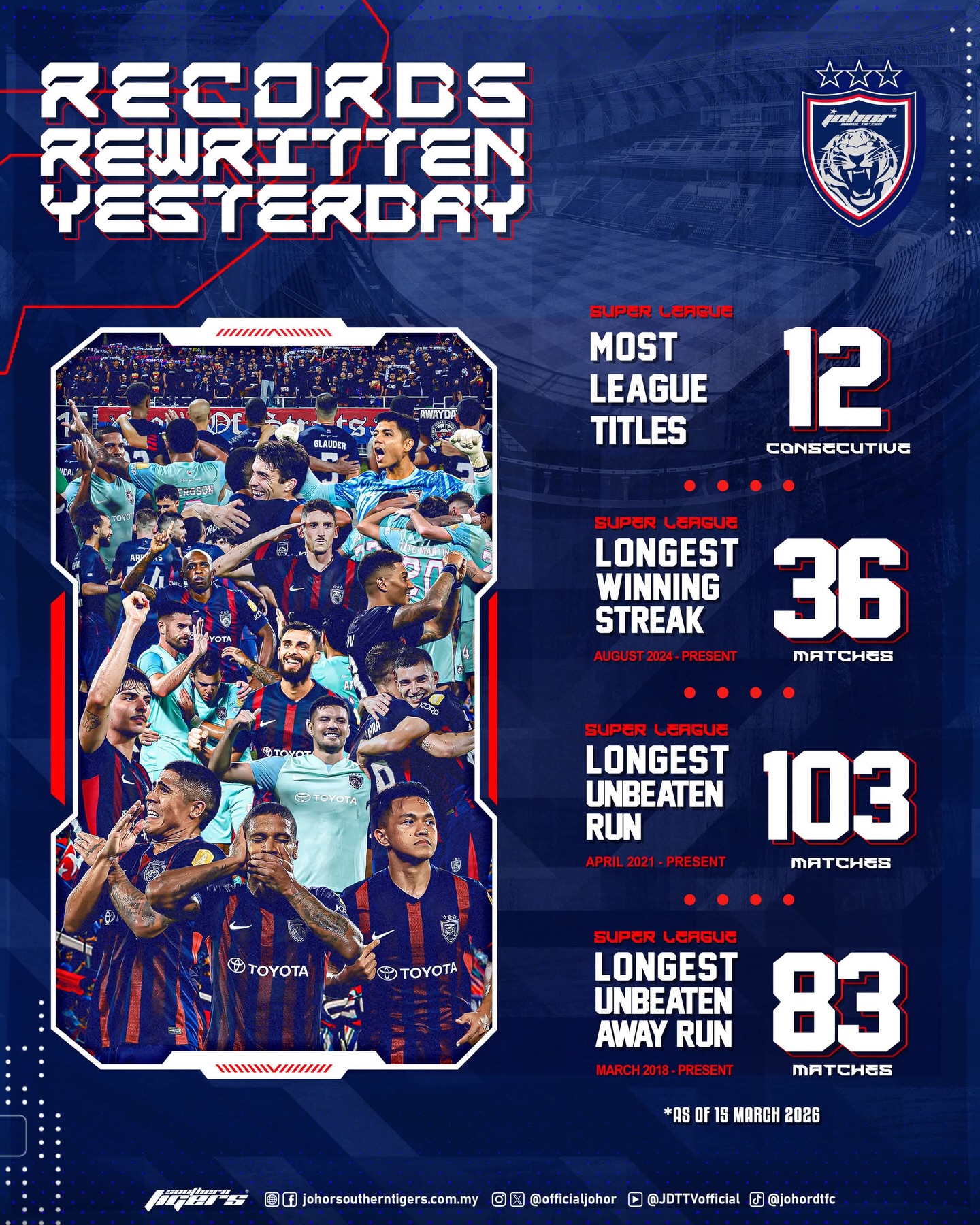 (新山16日讯)“南虎”JDT完成马超12连霸壮举!大臣发文祝贺,柔佛人民“敲碗”等特假。