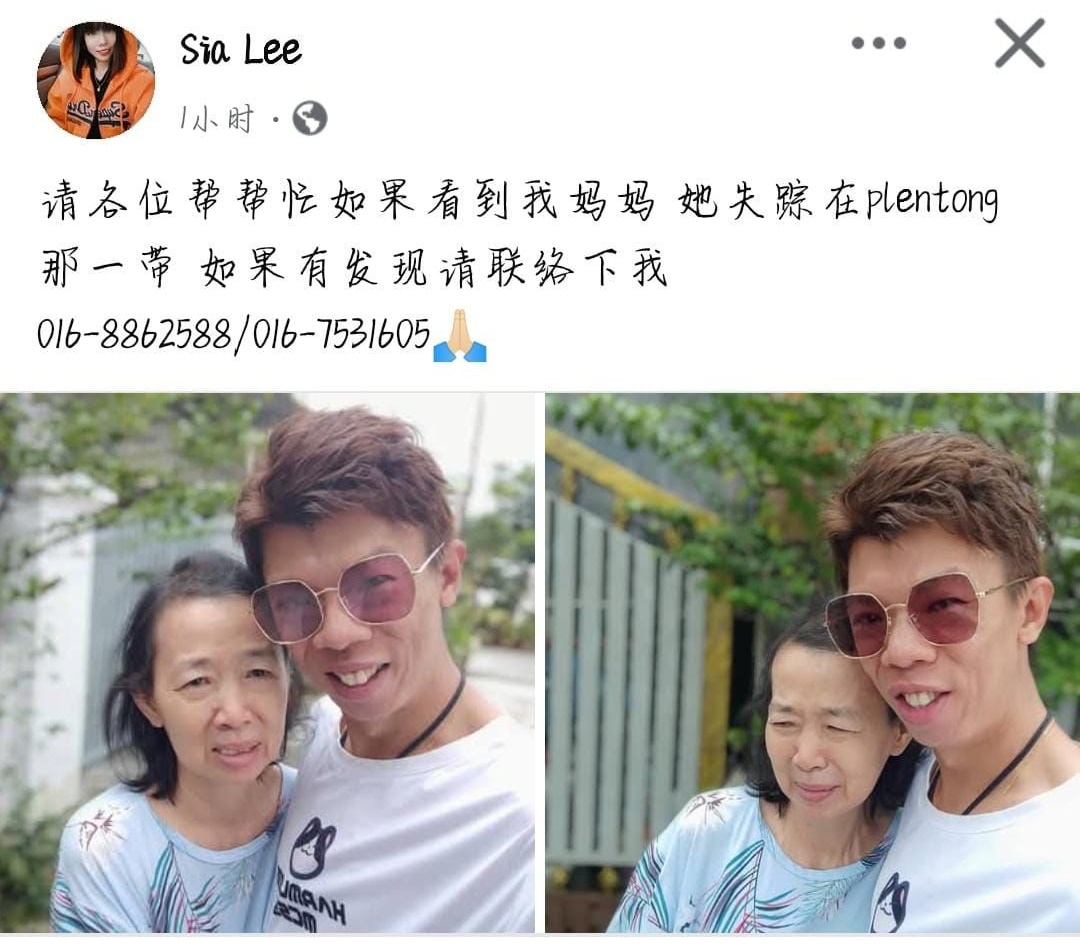 新山市议员陈珊珊今晚10时许直播,68岁的冯美梅今天中午时分,穿着睡衣出门,至今不知所终。