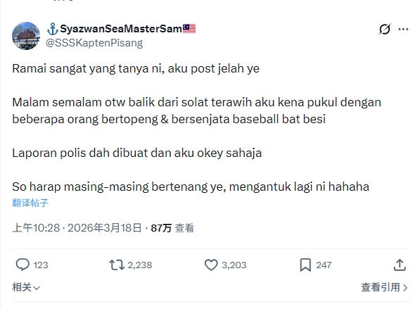 他说,根据投报,事件于3月17日,晚上9时50分发生,事主是33岁大马男子,当时他在清真寺祈祷后,骑摩哆回家。