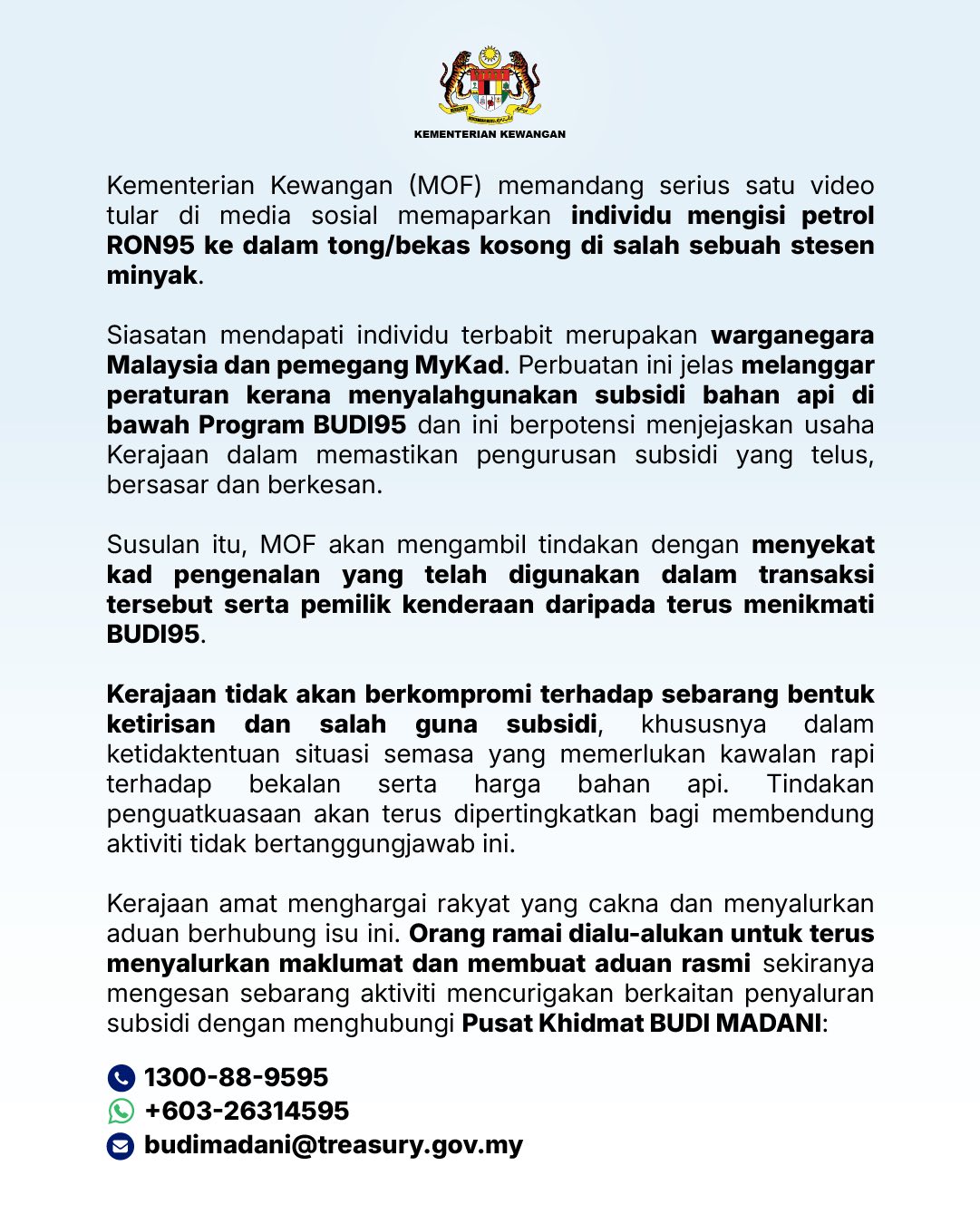 政府非常感谢关注并举报此事的公民。如发现任何与补贴发放相关的可疑活动,欢迎公众继续信息举报信或进行正式投诉,可联系BUDI MADANI服务中心: