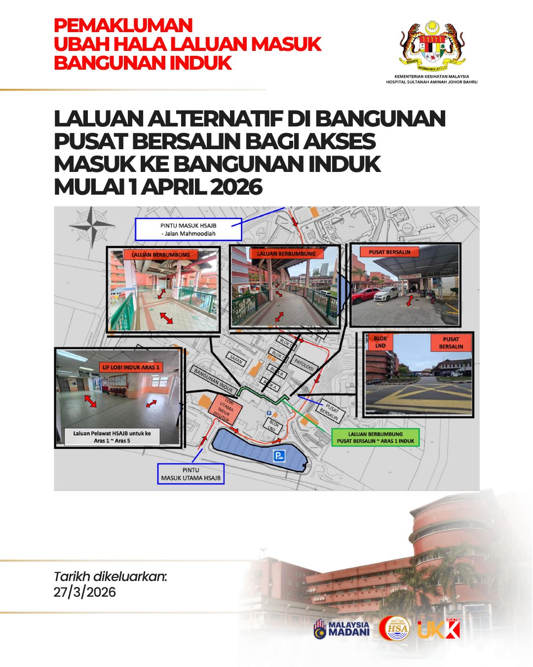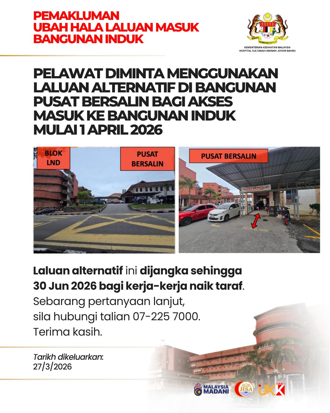 新山中央医院发出通告,在此期间,所有医院访客可使用替代路线,即穿过妇产科中心大楼,以及或1楼的有盖走廊前往主楼其他楼层。