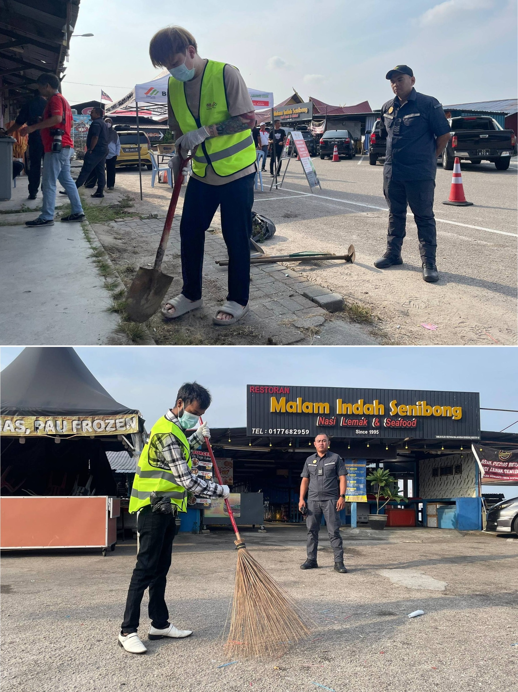 他们在避兰东的诗尼邦甘榜(Kampung Senibong)执行了2个小时的社区服务令,负责清理海边,包括清扫街道。