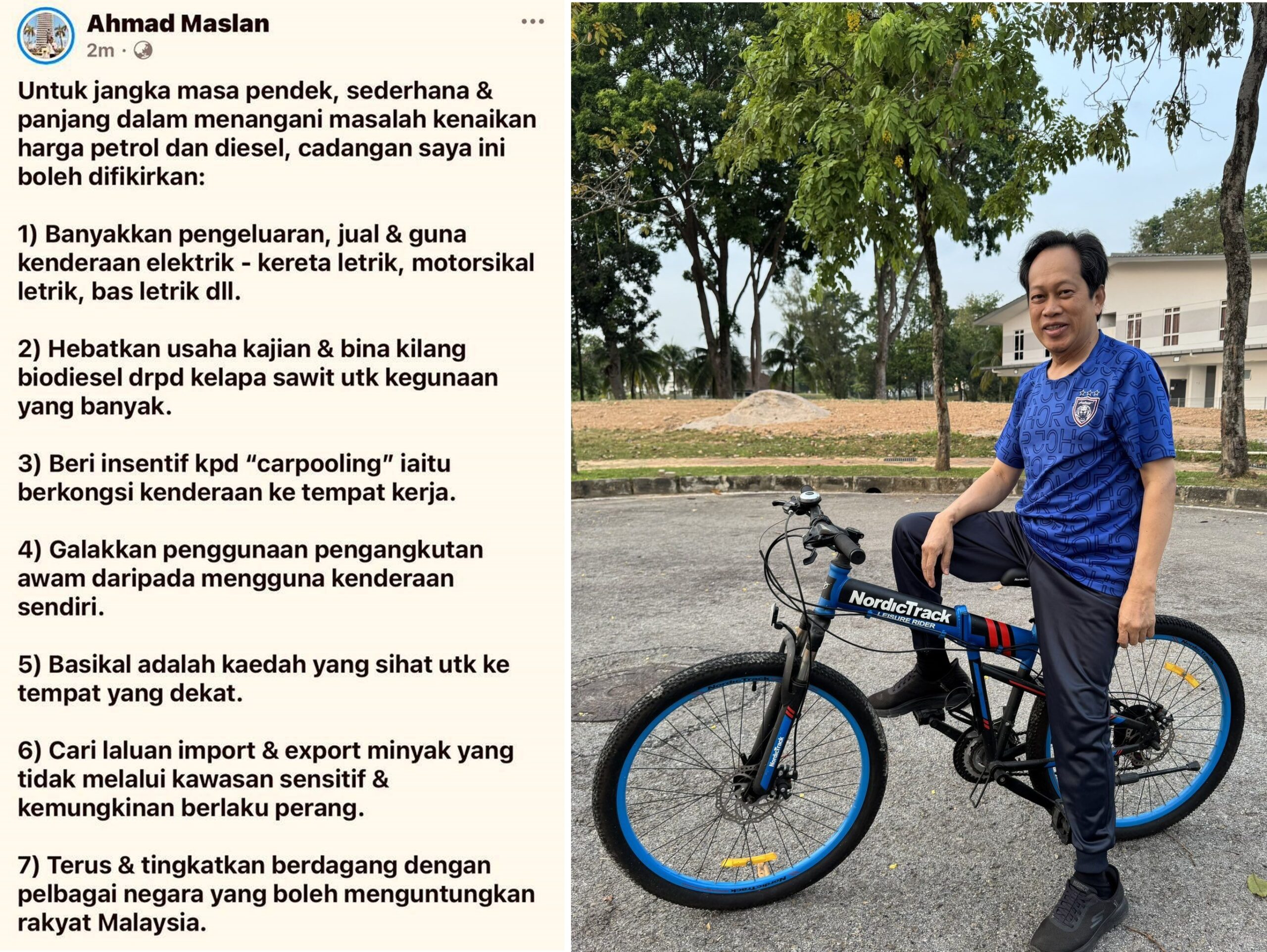 阿末马斯兰也是工程部副部长,他于日前针对短期、中期和长期应对汽油和柴油价格上涨问题,提出7项建议,当中包括“拼车”和骑脚车代步。