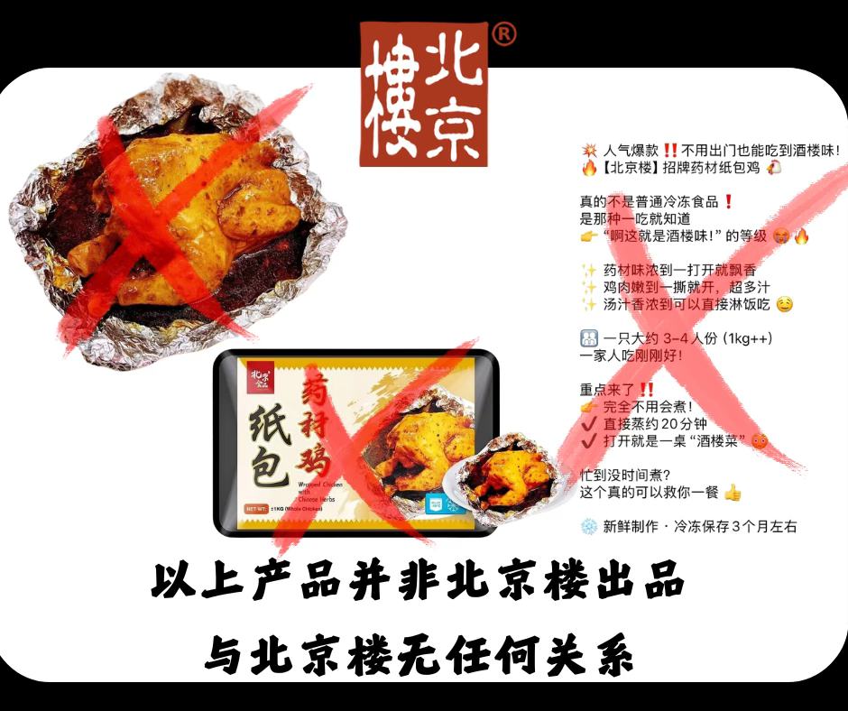 由于近日发现有网络平台使用“北京楼”名义,宣传及销售药材纸包鸡,“北京楼”特此澄清,有关产品并非北京楼旗下公司出品,亦未获得本公司任何授权。