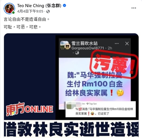 她说,让人遗憾的是,在首则污蔑性贴文发出后不久,网络上又流传造谣性贴文,指“金宝拉曼生已经收到文告,必须出席林良实葬礼”,有关当局不能坐视不理,不能再让这些造谣者和污蔑者逍遥法外。
