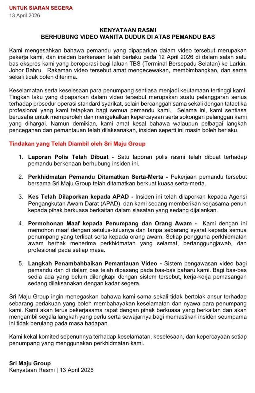 巴士公司正式声明中证实,视频中的男子为其员工。该起事件是于4月12日,在一辆从吉隆坡南湖镇综合车站(TBS)前往新山拉庆(Larkin)的长途巴士上发生。