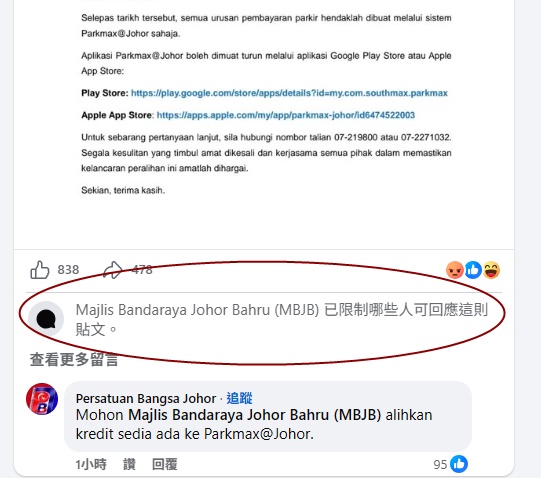 新山市政局的面子书,也因为太多民众涌入表达不满,已限制留言。