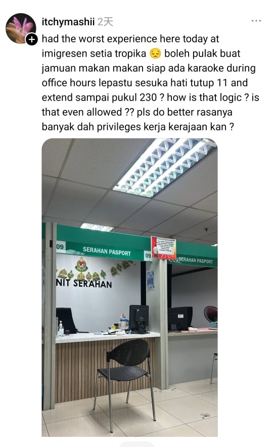 她说,当天在柔佛移民局总部(位于 Setia Tropika) 体验糟糕,,并指职员居然能在办公时间开派对、唱卡拉OK。