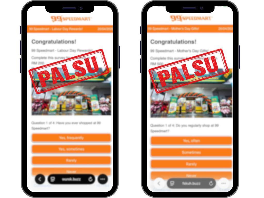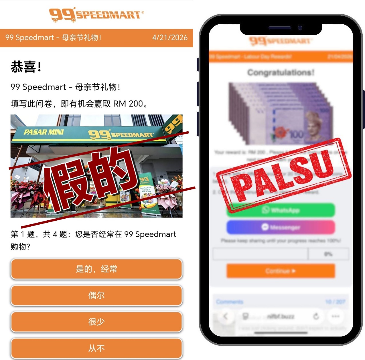 (新山21日讯)诈骗集团盗用99Speed Mart名义,发送问卷连接,诱骗可贏取200令吉至500令吉的奖金,妈妈们千万别相信。