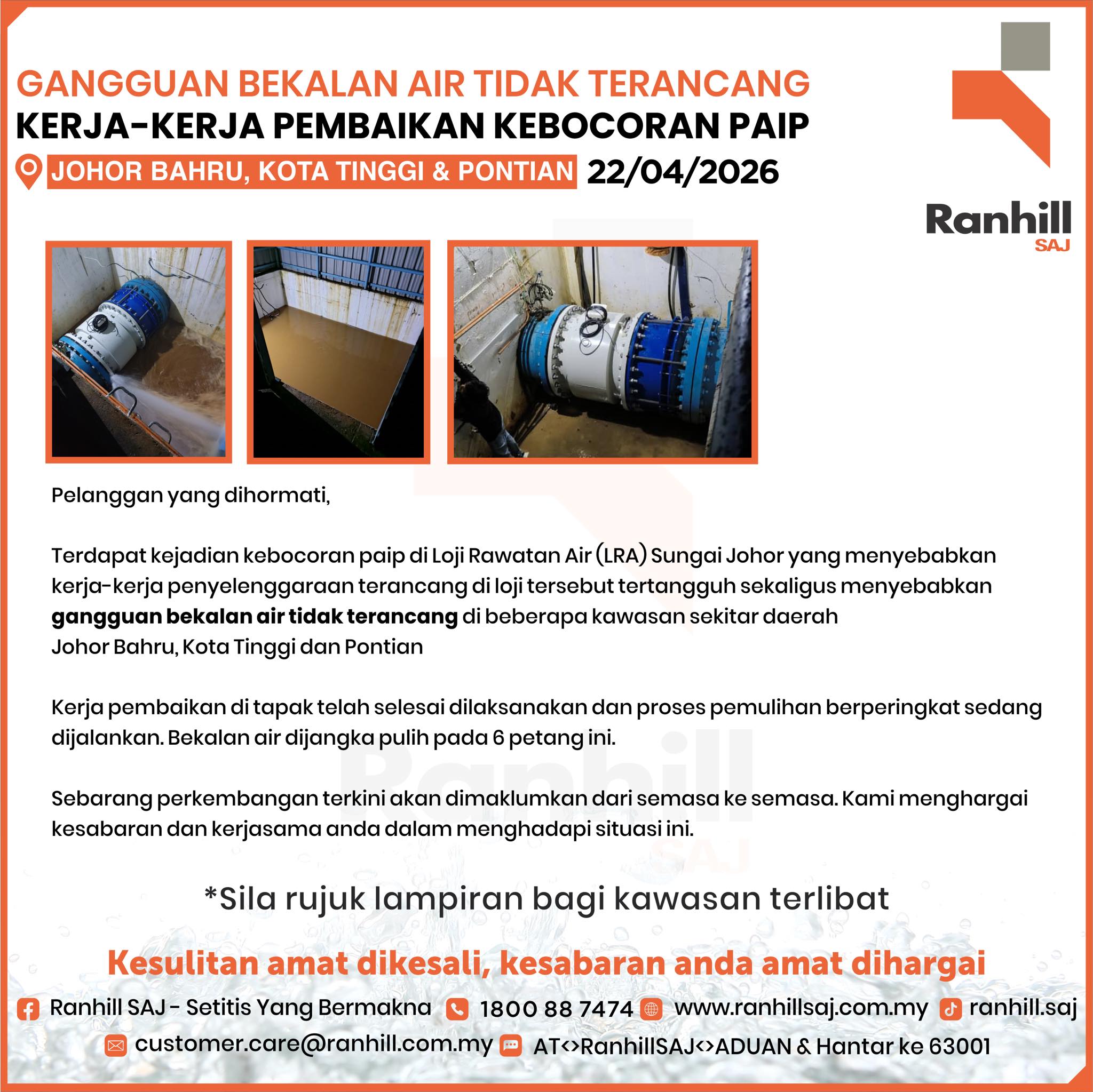 Ranhill SAJ事后指出,因步哥打丁宜的柔佛河水滤水站发生管道泄漏(水管爆),导致新山、哥打丁宜和笨珍等多个地区出现突发制水。