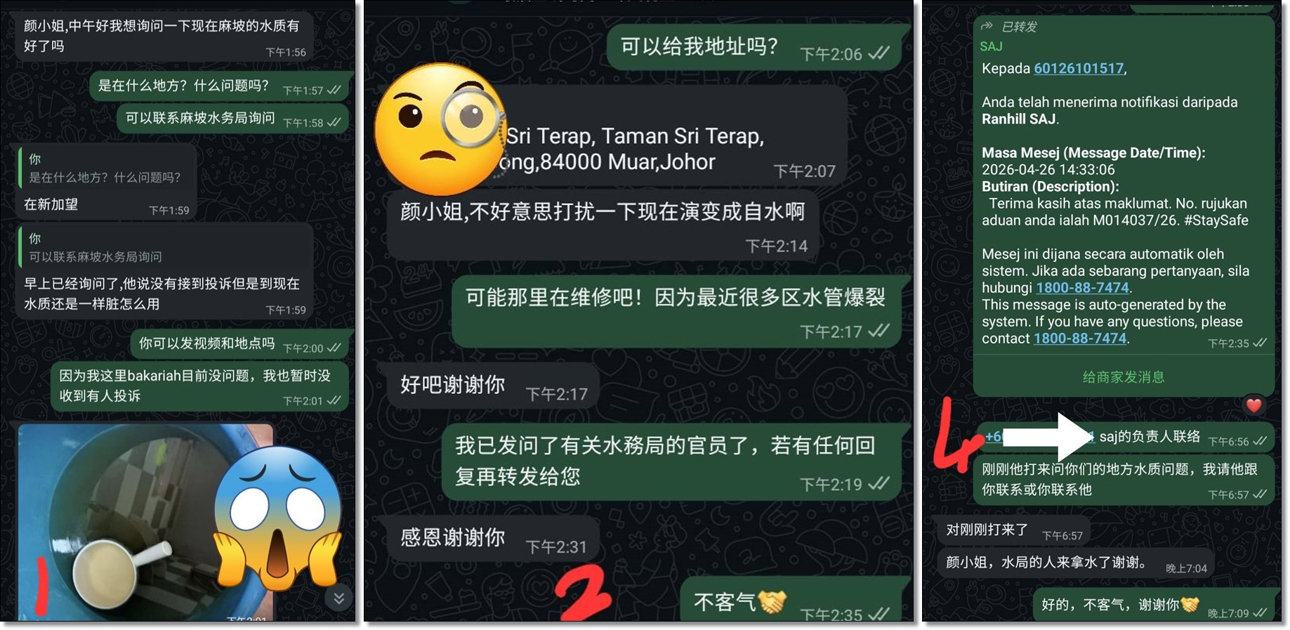 她说,尝试联系SAJ 却无人接听,但通过SAJ 提交投诉的处理速度反而比电话更快,相关官员也第一时间联系当事人,并前往现场取水样进行检测。