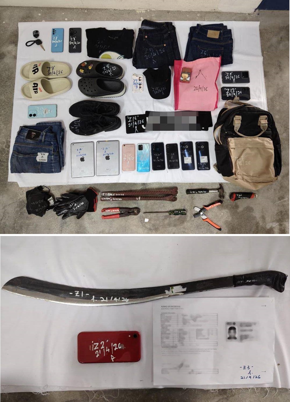 干案工具: 巴冷刀、撬棍(Kuku Kambing)、可调式钳子、铁锤、螺丝起子、面罩、手套及假车牌。
