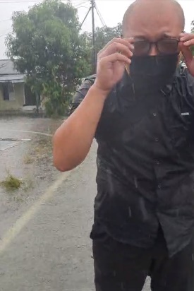 当时雨势还相当大,邹裕豪没有撑伞而全身湿透,连眼镜都是雨水。