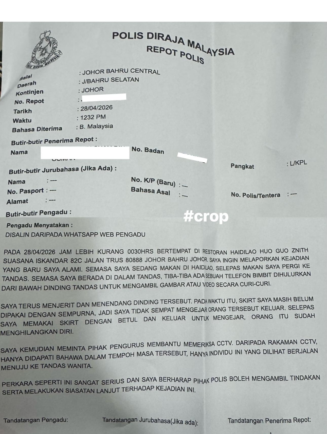 一名外华裔女子在昨日分享,在火锅店遇到偷拍狂的经历,并且已经向警方投报。