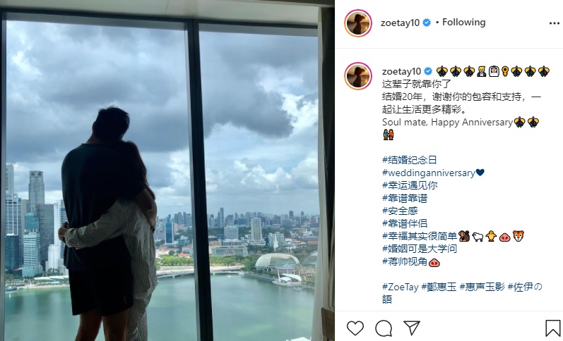 (新加坡22日讯)新加坡演艺圈阿姐郑惠玉与丈夫蒋菲立(蒋佳伟)结婚20年,今天她在社交媒体放闪两人拥抱合照,向老公喊话:“这辈子就靠你了!”
