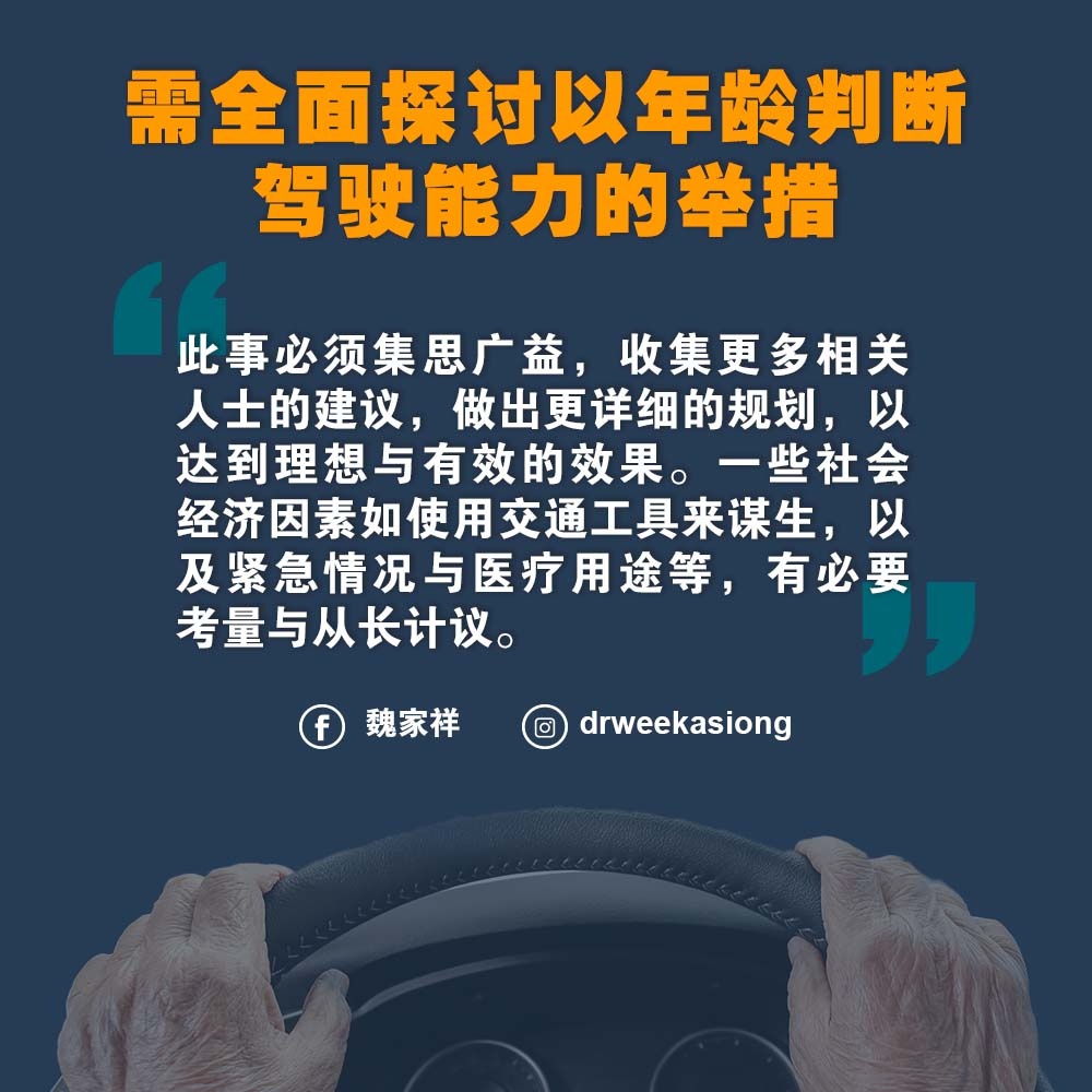 他说,针对限制发出驾照给70岁或超过70岁乐龄人士的建议,必须探讨一个更广泛和全面的方案,包括流动性的需要及其它社会经济因素,而不是纯粹以年龄因素作为考量。