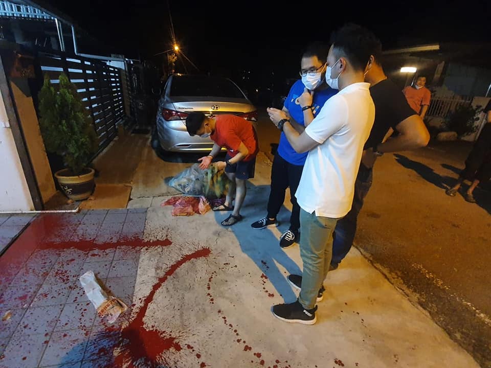 蔡建文位于古来公主城的住处,铁门、地面、墙壁、父亲和弟弟的车皆中招中红漆。