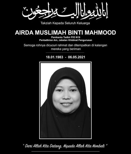 早前报导,38岁巫裔女子Airda Muslimah感染新冠肺炎,于5月6日病逝。她生前在依斯干达公主城市政局的服务管理部门任职行政人员。