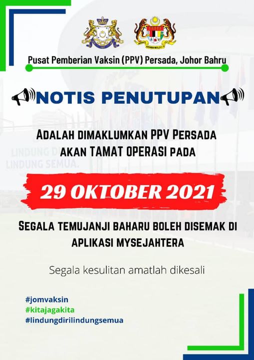 (新山24日讯)位于柔佛国际会展中心(Persada Johor)的疫苗接种中心宣布,10月29日关闭。
