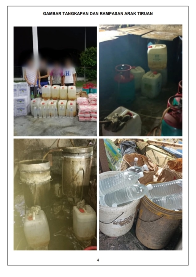 他指出,现场起获210个塑料瓶,每瓶装有1.5公升的疑是三蒸酒(samsu),另各装有20公升三蒸酒的14个酒桶,3桶煤气、2套厨具、2个盆、22包糖、2桶蓝色颜料和1000令吉现款,总价值约1万5992令吉。